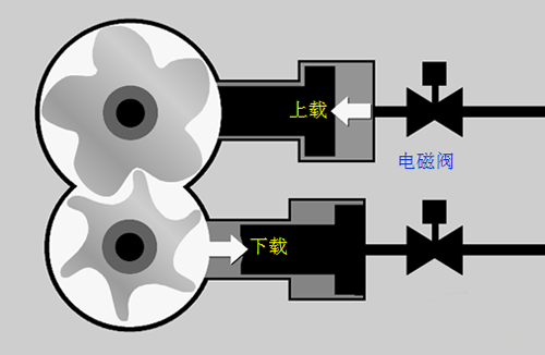 柱塞式調(diào)節(jié)被廣泛應(yīng)用于螺桿式冷水機組調(diào)節(jié)。下圖為某品牌冷水機組柱塞式調(diào)節(jié)示意圖。