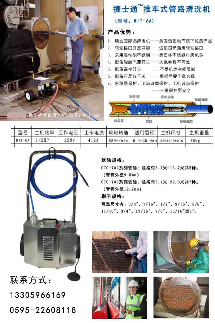 國內(nèi)首創(chuàng)中央空調(diào)冷凝器清洗軟軸緩解裝置.清洗機(jī)軟軸造價昂貴但同時又極易損壞,這成了所有工程人員面臨的巨大難題.我公司在2006年即成立軟軸科研項目小組,不斷提高軟軸材質(zhì)并多次人工模擬極端惡劣環(huán)境進(jìn)行試驗(yàn).同時,科研人員在07年底設(shè)計出軟軸緩解裝置,該裝置在軟軸卡住的情況下將電機(jī)輸送力度減小%60,這樣可以有效的保護(hù)軟軸.這一技術(shù)在08年得到了完善并于09年正式面市.精選的材質(zhì)和獨(dú)到的保護(hù)裝置使軟軸使用壽命延長一倍以上. 二, 刷頭工具采用上等材質(zhì)精致而成,刷頭種類更多,刷毛有效長度增加,清洗效率也大大提高.刷毛的材質(zhì)直接影響到清洗的效率而刷頭的整體尺寸更是影響到軟軸的動力傳輸.刷頭選用不合理很可能造成軟軸卡在銅管里,嚴(yán)重時軟軸將直接斷掉.我公司技術(shù)人員多次分析比較不同規(guī)格刷頭的使用效果,進(jìn)而設(shè)計出清洗效率更高同時對軟軸力度傳輸影響又最小的刷頭規(guī)格. 三, 主機(jī)采用多級控制電路.該技術(shù)可保證主機(jī)的使用連續(xù)性,保證用戶的清洗工程不會因?yàn)闄C(jī)器不能使用而耽誤.